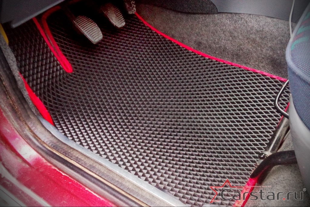 Толщина ковриков EVA составляет 10-12 мм. Глубина ячеек 7-8 мм. Такая толщина ковриков позволяет им служить довольно долго, не протираясь до 3 лет. А благодаря такой глубине ячеек коврик EVA площадью 1 кв.м. способен захватить около 3,5 л жидкости, сохраняя в чистоте вашу обувь и обивку салона.