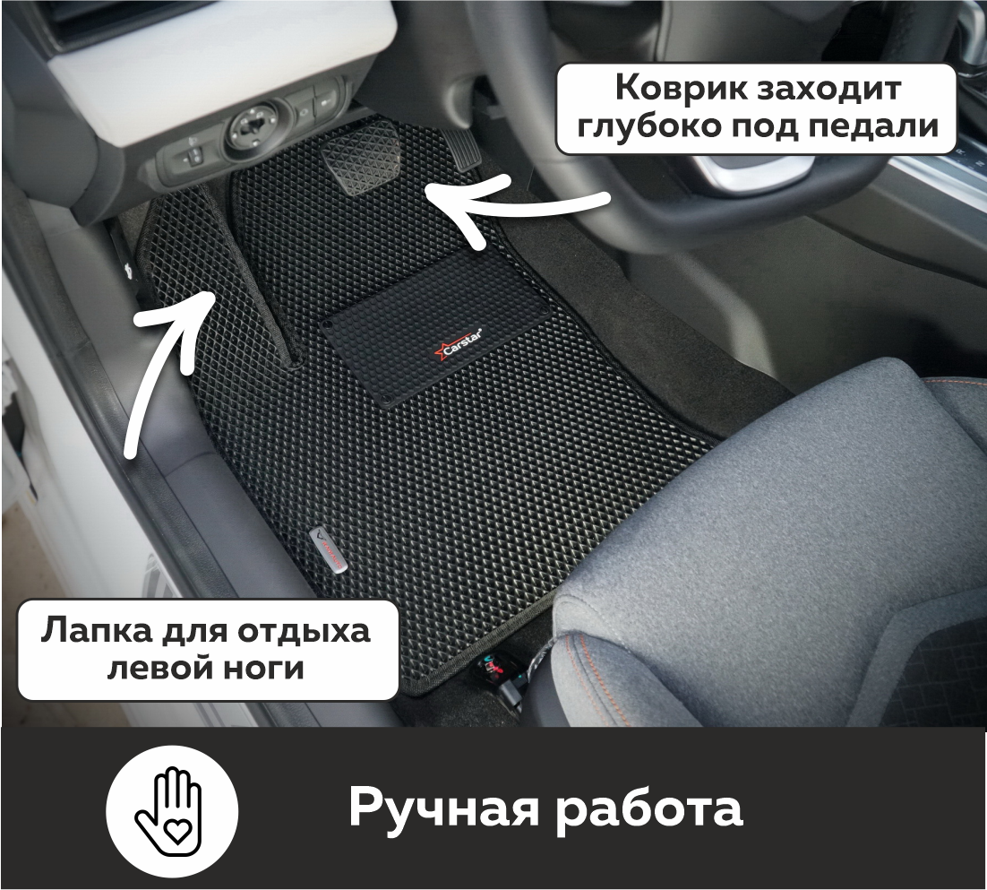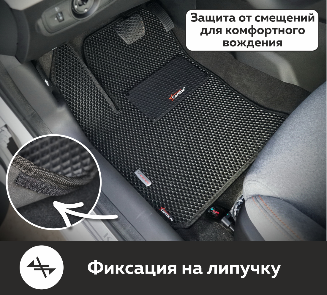 Коврики EVA надёжно крепятся с помощью оригинальных систем фиксации. Благодаря клипсам и липучке коврики защищены от смещений, что обеспечивает комфорт и безопасность вождения. Максимальное удобство также достигается точными, улучшенными лекалами для каждого автомобиля.
