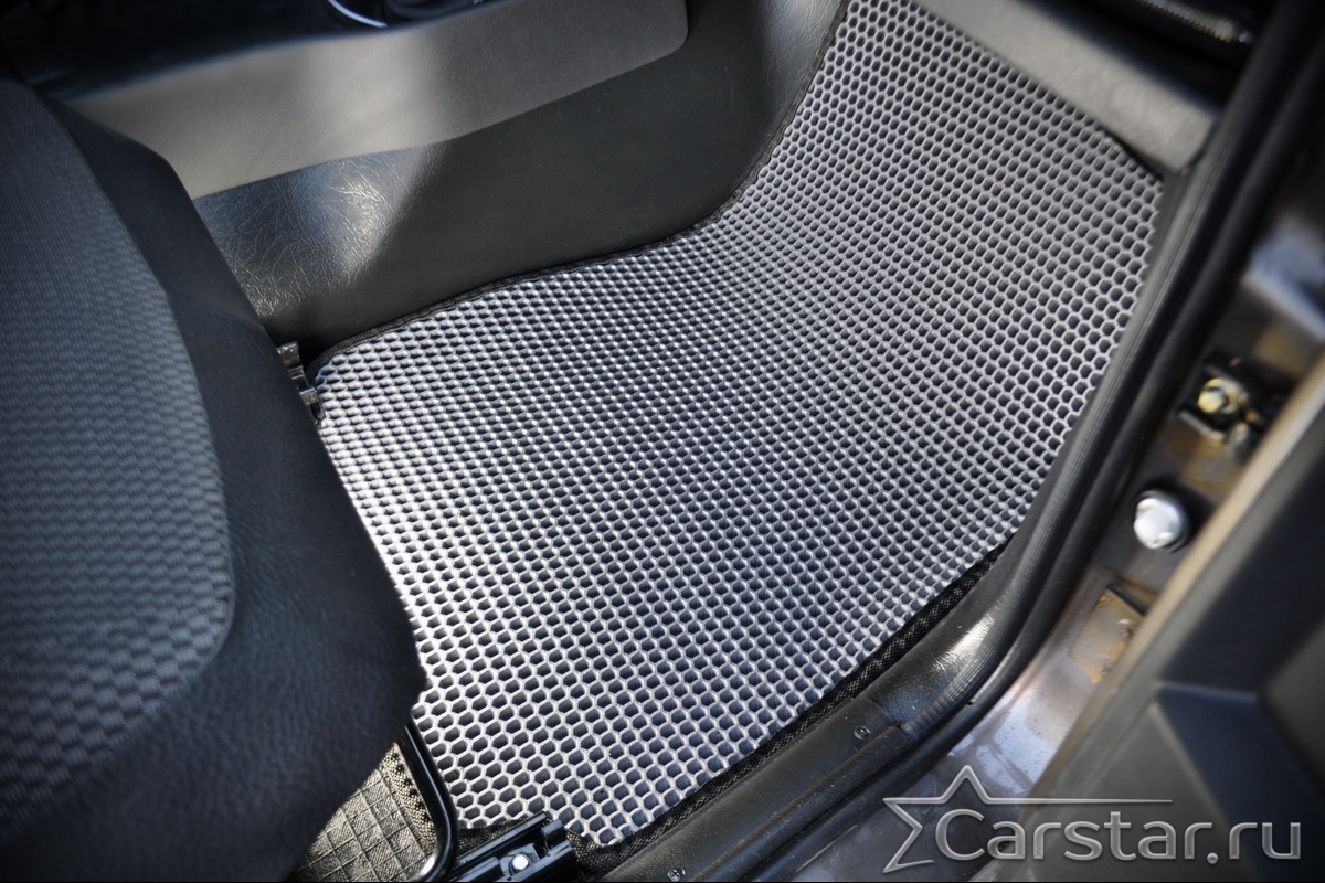 Толщина ковриков EVA составляет 10-12 мм. Глубина ячеек 7-8 мм. Такая толщина ковриков позволяет им служить довольно долго, не протираясь до 3 лет. А благодаря такой глубине ячеек коврик EVA площадью 1 кв.м. способен захватить около 3,5 л жидкости, сохраняя в чистоте вашу обувь и обивку салона.
