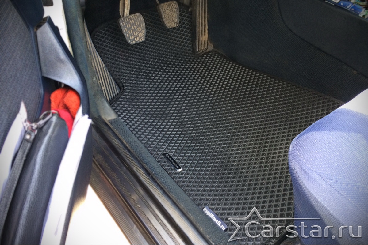 Толщина ковриков EVA составляет 10-12 мм. Глубина ячеек 7-8 мм. Такая толщина ковриков позволяет им служить довольно долго, не протираясь до 3 лет. А благодаря такой глубине ячеек коврик EVA площадью 1 кв.м. способен захватить около 3,5 л жидкости, сохраняя в чистоте вашу обувь и обивку салона.