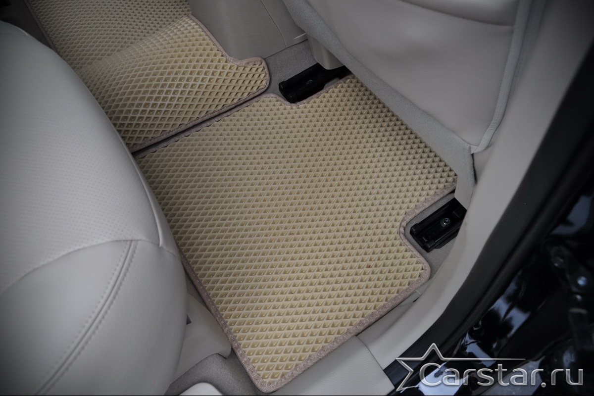Толщина ковриков EVA составляет 10-12 мм. Глубина ячеек 7-8 мм. Такая толщина ковриков позволяет им служить довольно долго, не протираясь до 3 лет. А благодаря такой глубине ячеек коврик EVA площадью 1 кв.м. способен захватить около 3,5 л жидкости, сохраняя в чистоте вашу обувь и обивку салона.