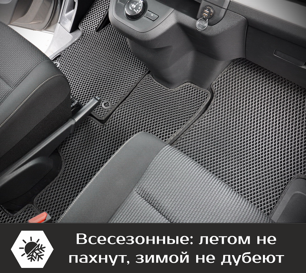 Коврики EVA всесезонные. Их можно использовать зимой, так как они не трескаются на морозе и остаются пластичными до -50 °С. А также летом, так как они не выделяют запаха на жаре до +50 °С. Зимой коврики спокойно выдерживают контакт с дорожными реагентами. Материал абсолютно непромокаемый. Ячеистая структура коврика эффективно собирает снег, грязь, песок, пыль круглый год.
