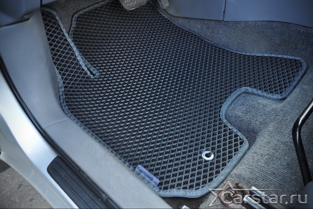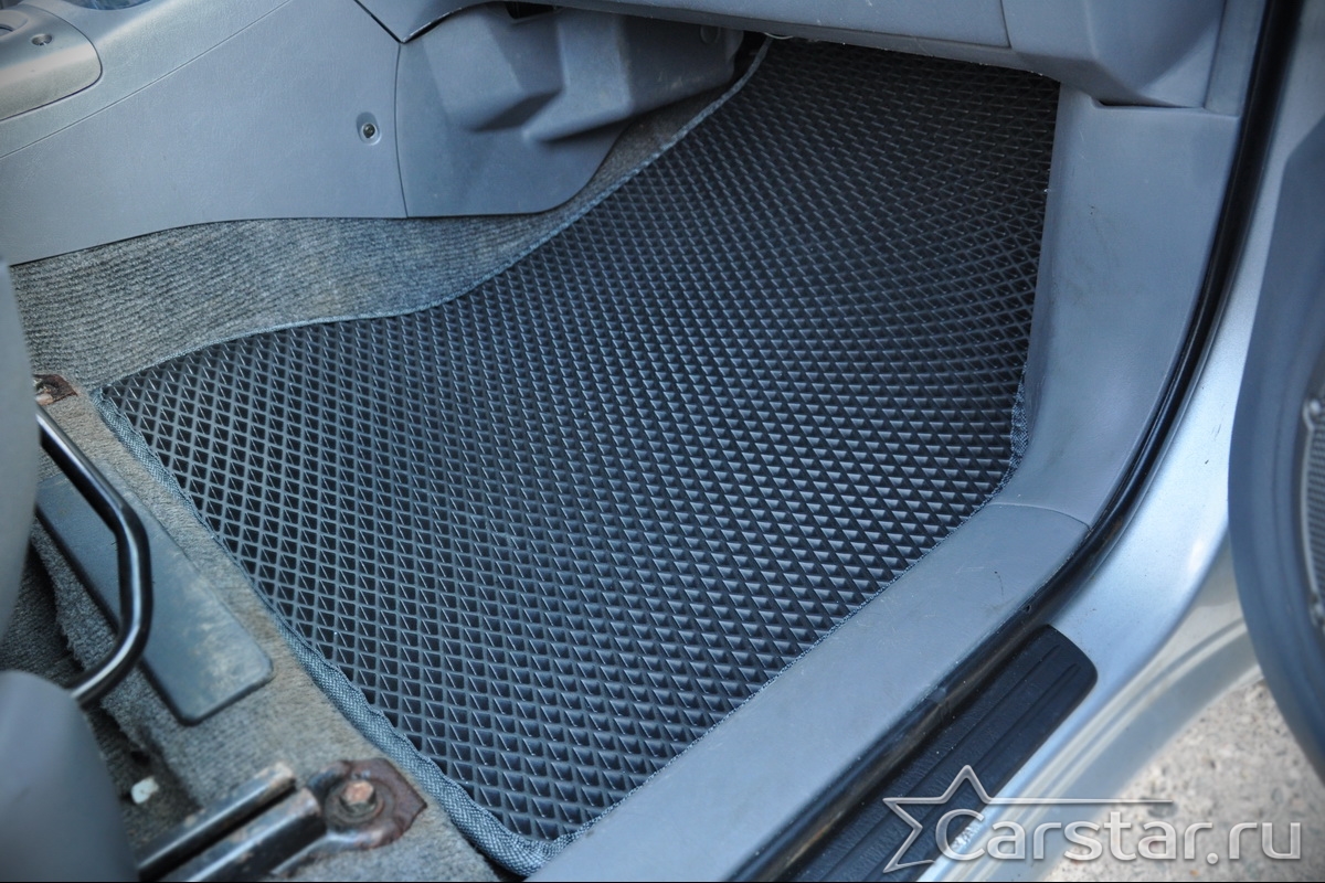 Толщина ковриков EVA составляет 10-12 мм. Глубина ячеек 7-8 мм. Такая толщина ковриков позволяет им служить довольно долго, не протираясь до 3 лет. А благодаря такой глубине ячеек коврик EVA площадью 1 кв.м. способен захватить около 3,5 л жидкости, сохраняя в чистоте вашу обувь и обивку салона.