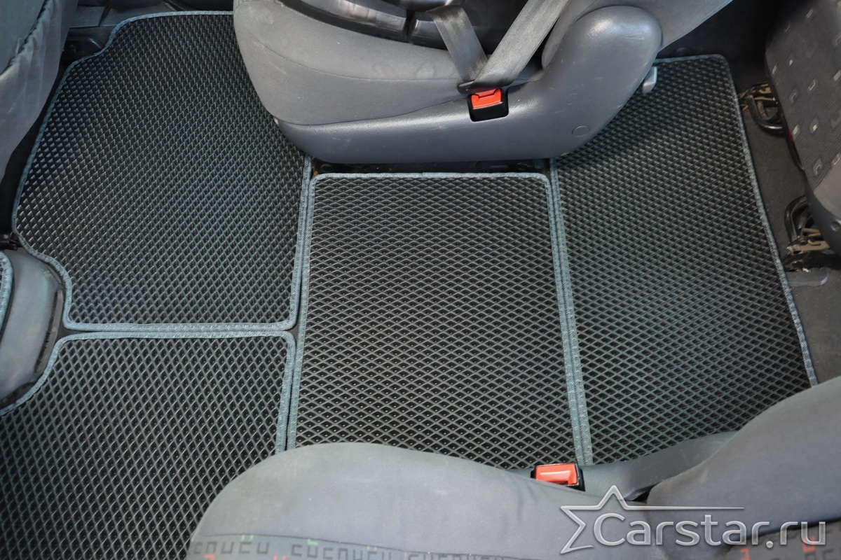 Толщина ковриков EVA составляет 10-12 мм. Глубина ячеек 7-8 мм. Такая толщина ковриков позволяет им служить довольно долго, не протираясь до 3 лет. А благодаря такой глубине ячеек коврик EVA площадью 1 кв.м. способен захватить около 3,5 л жидкости, сохраняя в чистоте вашу обувь и обивку салона.