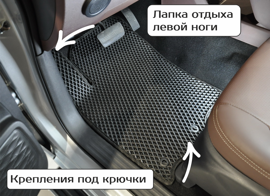 Обратная сторона резиновой основы покрыта шипами противоскольжения. Также присутствуют оригинальные клипсы крепления коврика к полу. Если в полу предусмотрены крючки, то в коврике устанавливаются ответные люверсы. Коврик надёжно держится на месте, не ёрзает, не попадает под педали, не создаёт аварийных ситуаций.
